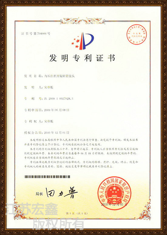 The HD version of the certificate of patent for invention - internal pressure self-sealing rotary pipe joint