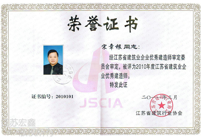 2011年3月30日,江苏省建筑业优秀项目经理会议在常州锦江国际大酒店完美落幕。江苏宏鑫集团、江苏宏鑫旋转补偿器科技有限公司董事长宋章根先生被评为“江苏省建筑业企业优秀建造师”。